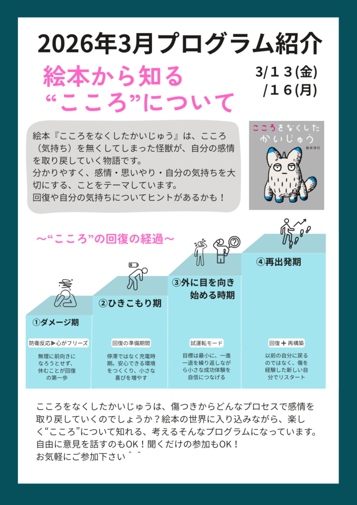3月13日(金)、16日(月)13:30~「絵本から知る”こころ”について」というプログラムを行います。